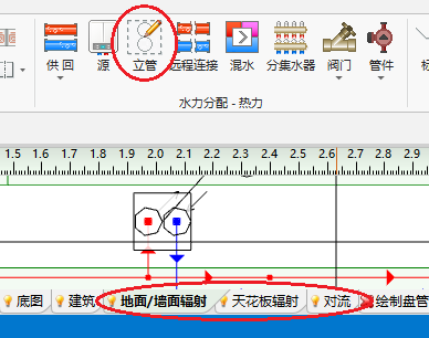 在主工具 条中,有立管 部件,仅可在如下编辑范围时可用:地面/墙面辐射,顶面辐射, 对流。
