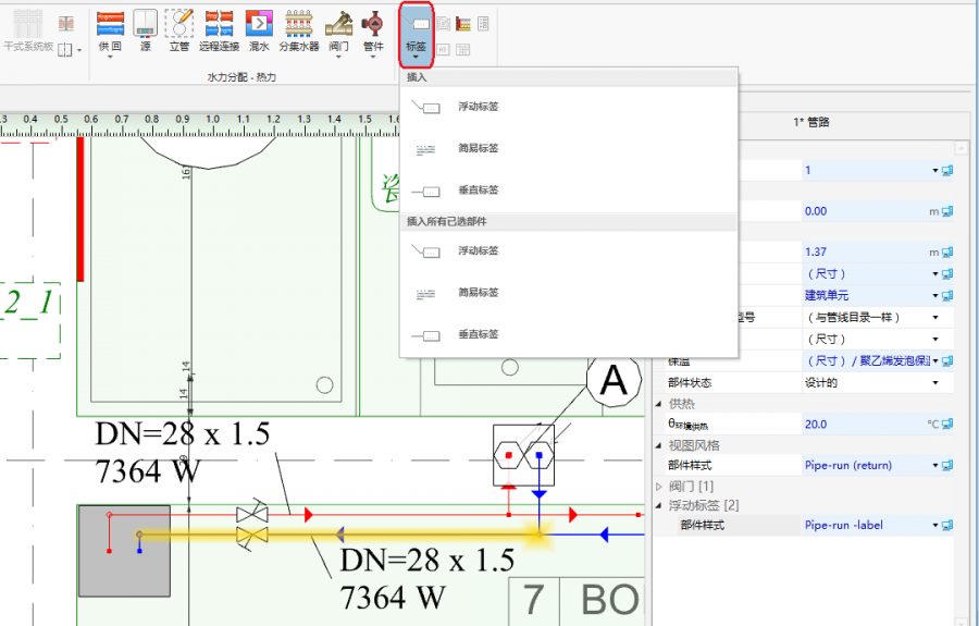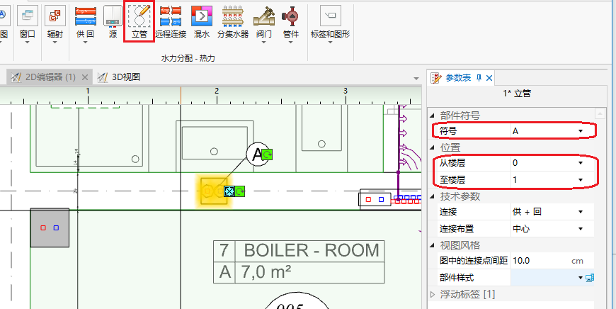 - 安放立管,并给它指定一个符号,然后定义它的高程(从0层至1层)。