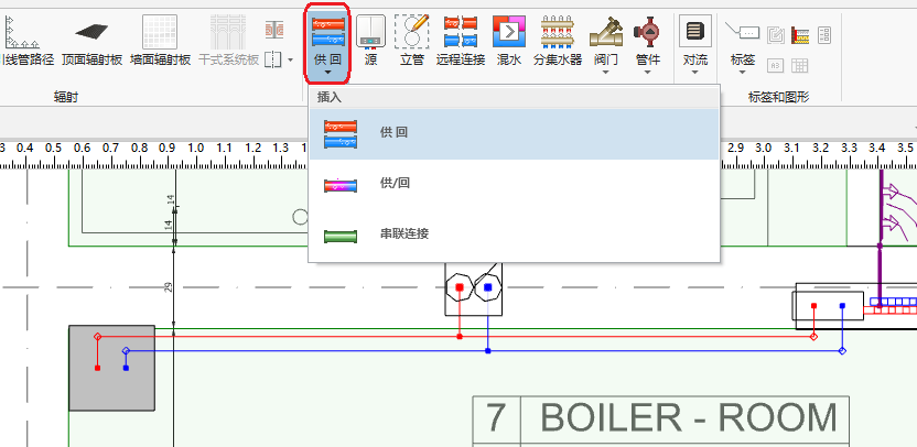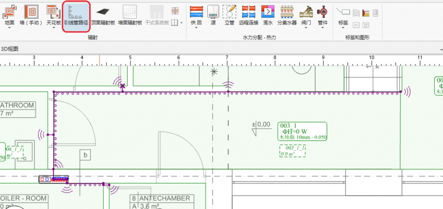 - 使用引线管路径 将分集水器与供热/供冷区连接。引线管路径 能够自动生成引线管。