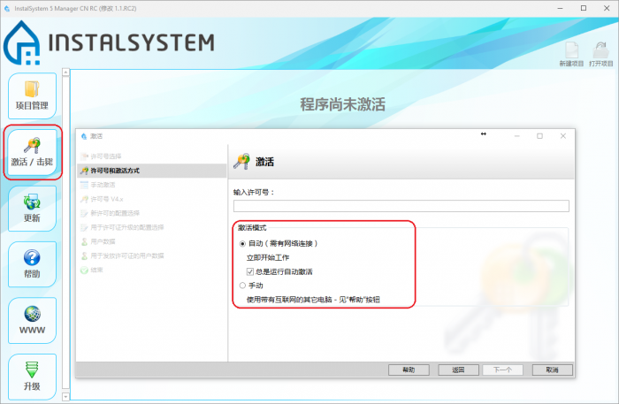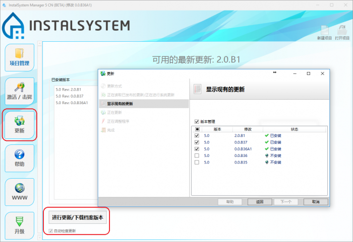 1. 激活 - 更新 - 可以下载最新版本的软件包,也可下载一些旧版本的软件包。程序和目录数据是不断地扩展和更新的,对它们的修改是以新的软件包版本的形式对外发布的。建议定期更新 软件并使用最新可用的版本。更新 是通过在InstalSystem Manager 5 上运行更新来完成的,它也不收取任何费用。InstalSystem Manager 5 有是否需要通知用户关于程序版本更新的选项。在更新 期间,可以选择和下载数个程序的版本,包括存档版本。InstalSystem 5 有一独特的特点,就是可下载和保存数个程序的版本,并同时使用它们来处理项目。特别是可以使用创建项目时所使用的程序版本来处理存档项目,同时也可以用最新的程序版本创建新项目。