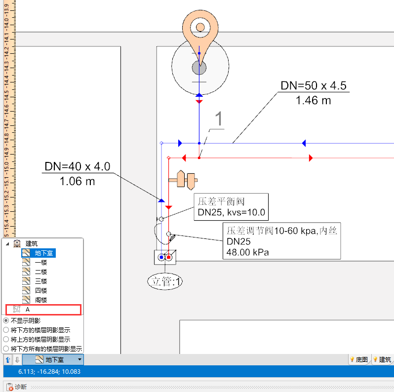 - 分集水器后面的装置 - 生成分集水器以外的示意图(必须勾选立管后面的装置 复选框)。