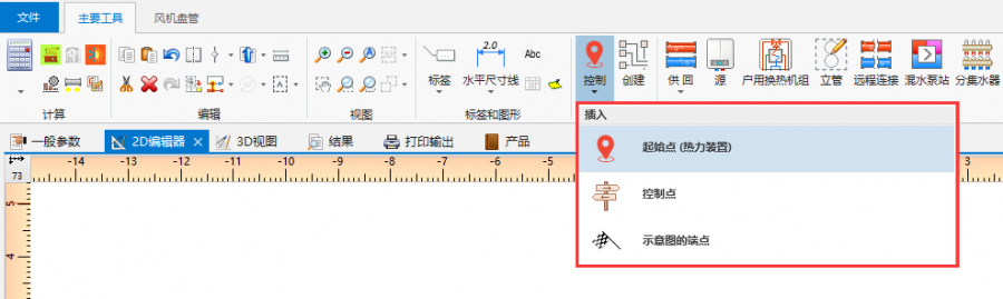 用于控制示意图自动生成的组件和功能图标可在2D编辑器 窗口内的对流 、地面/墙面辐射 、顶面辐射 编辑器中的主工具 内找到。