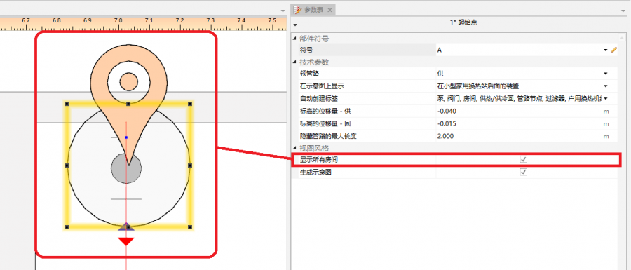 - 户用换热站后面的装置 - 生成从指示点到站的示意图,包括站外的安装(必须勾选立管后面的装置 复选框)。
