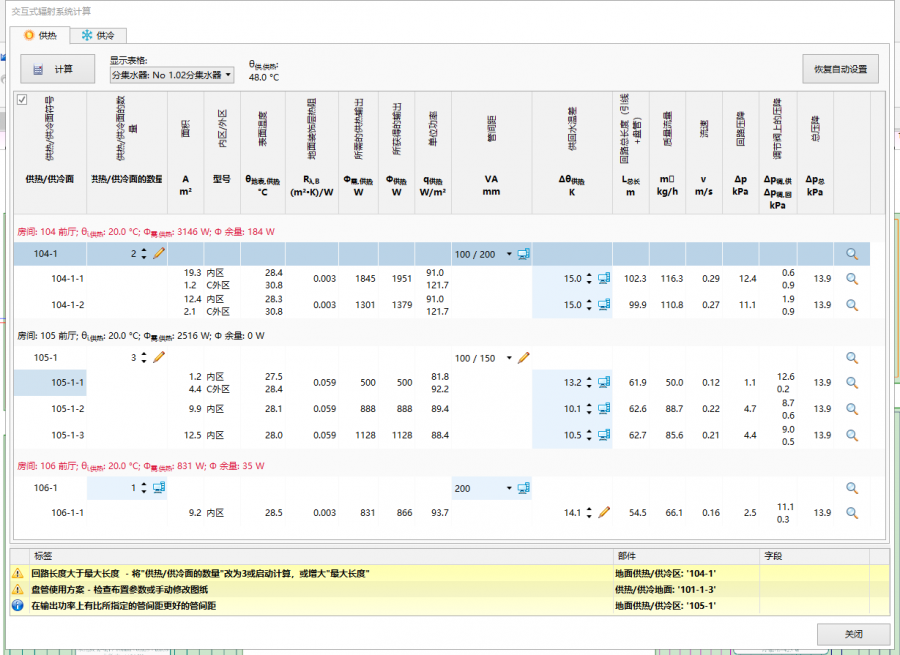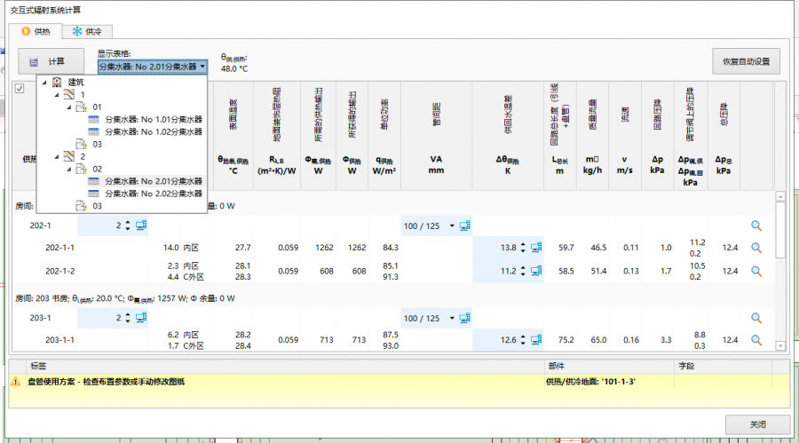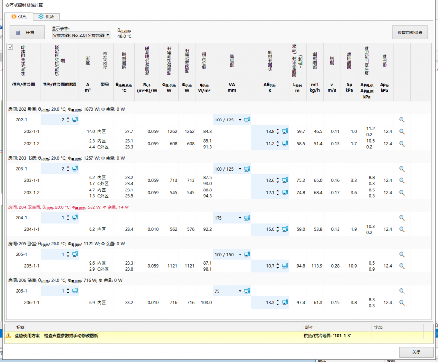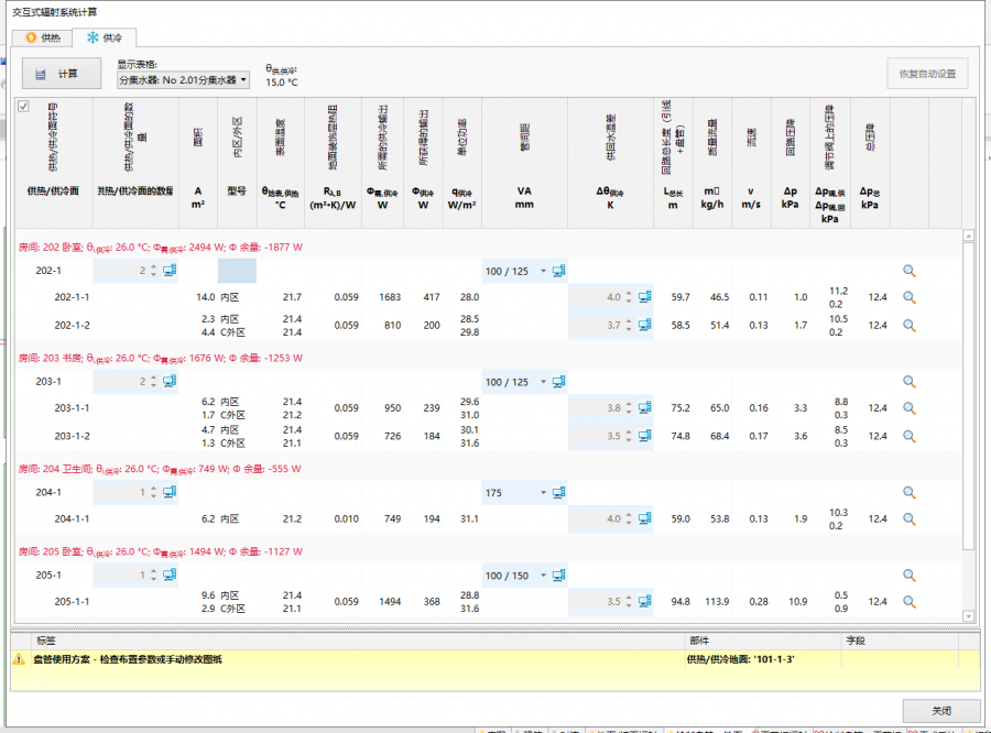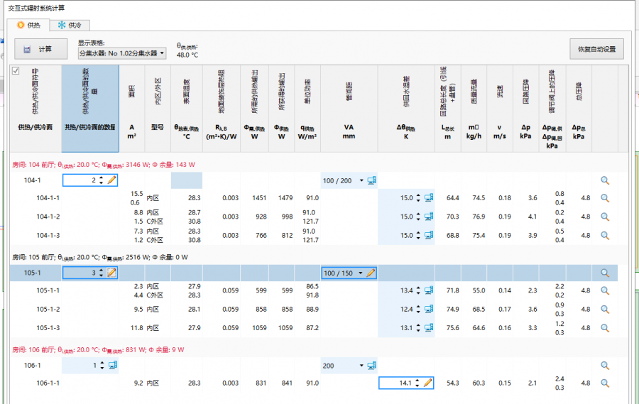 修改这些参数中的任何一个参数,然后单击计算 ,就可根据手动修改后的参数对各分集水器所带的各回路进行最小范围的计算,而不是整个系统的计算,因此: