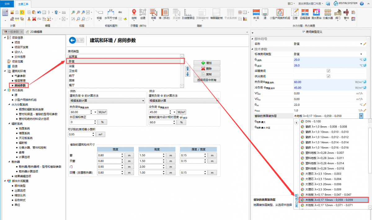 供热/供冷区的构造编辑器位于:点击供热/供冷区 ,查看其参数表 ,在地面供暖/供冷构造 \ 墙面供热/供冷构造 \ 天花板供热/供冷构造 的下拉菜单中。